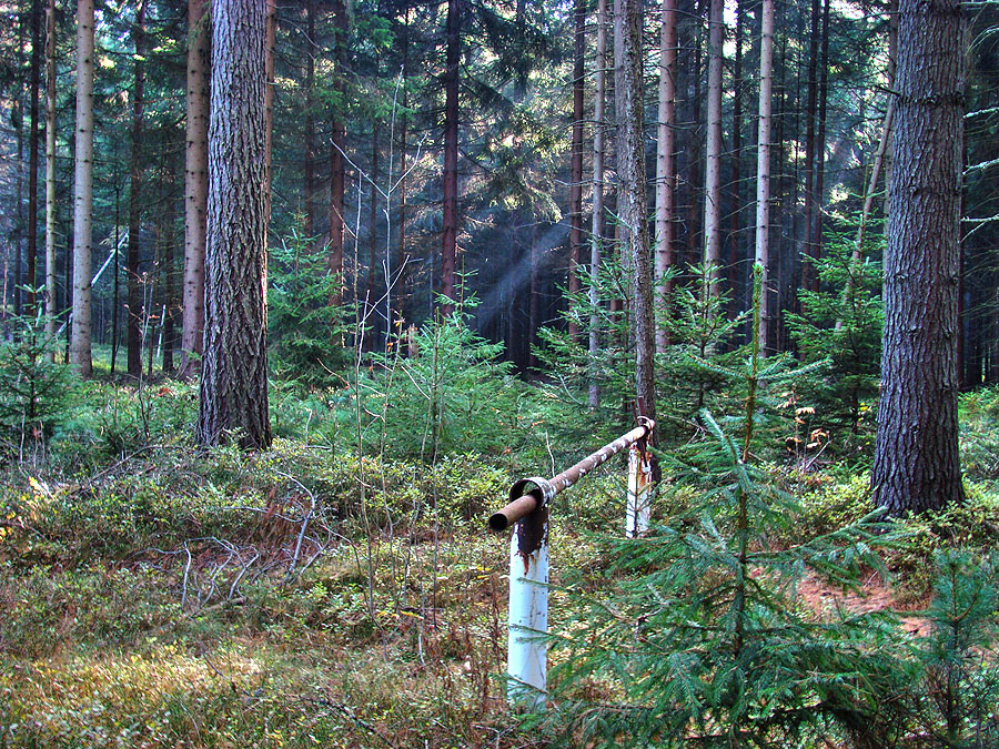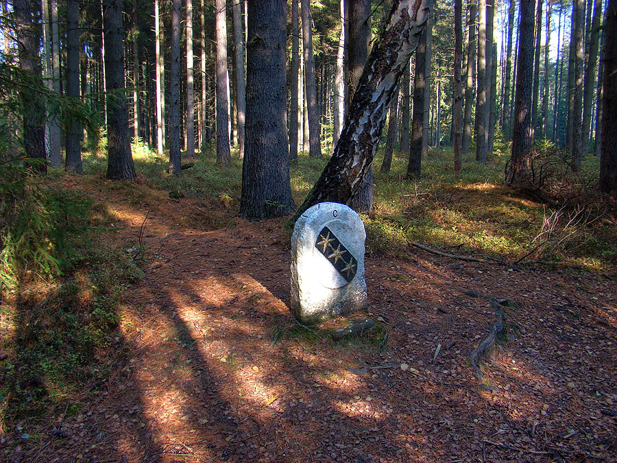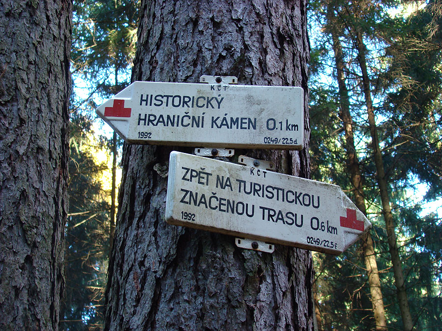 turistický ukazatel k historickému kameni cesta vedoucí po česko-neměcké hranici hraniční kámen z roku 1718 kámen s erbem rodu Lindenfelsů