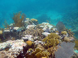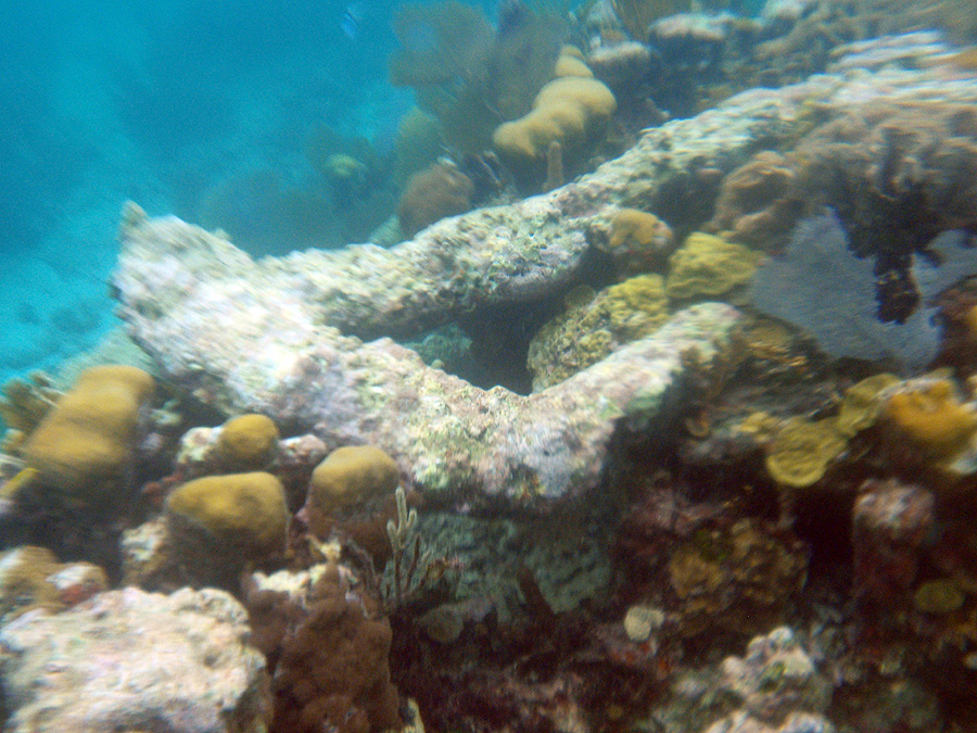 pokus vyfotit korály skrz voděodolný obal   korálový útes necelých 19km od pobřeží Belize